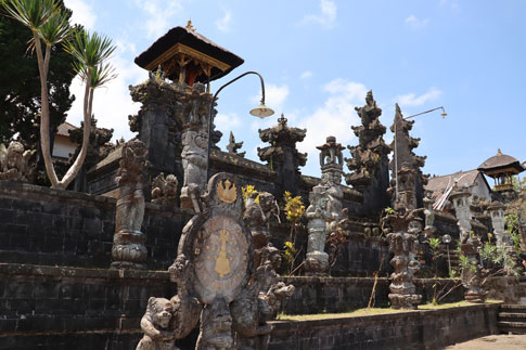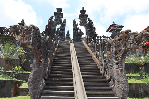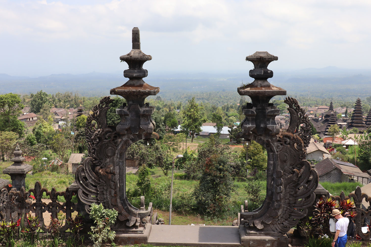 ブサキ寺院の敷地はとっても広く、大小約30もの寺院を観光しながら上がっていくと1時間はあっとい う間。日陰がないので暑さ対策は忘れずに。途中、飲み物やスナック類をテントで売るキオスク。バリ島 らしい光景。寺院上に着いたところにはインドネシアの伝統工芸品のお土産店があります。