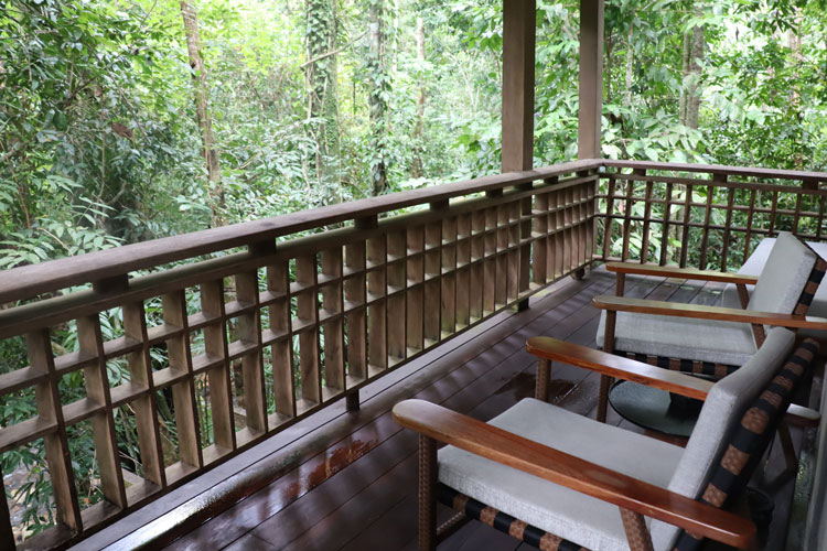 広々としたお部屋にゆったり入れるバスタブにはバスソルトとキャンドルが備えられバスタイムも楽しみ!2つある洗面台も忙しい朝には助かります。ベランダにはウッドチェアがあり、バードウォッチング はいかがでしょうか。広々としたベッドルームの大きな窓からはフォーレストの眺め。朝は鳥の鳴き声で目が覚め、時にはサルの木渡りの音。自然の楽園そのもの。 ベランダからフォーレストを眺めていると、何やらガサガサと音が・・・よ~く観てみるとサルの親子が木から木へと移動中。お部屋にはサルがお部屋の中に入ってくることがあるためドアは直ちに閉めるようにとの注意書き。ネイチャーならではですね。 全室スイートのお部屋ではミニバーはすべて無料&無料wifi。