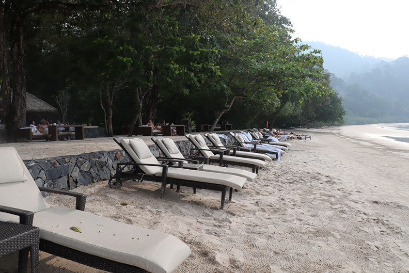 白い砂浜ビーチにはサンデッキチェアーがズラリ。木陰でゆったり読書やお昼寝はいかがでしょうか。