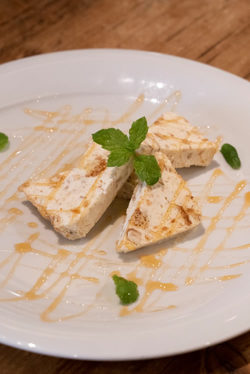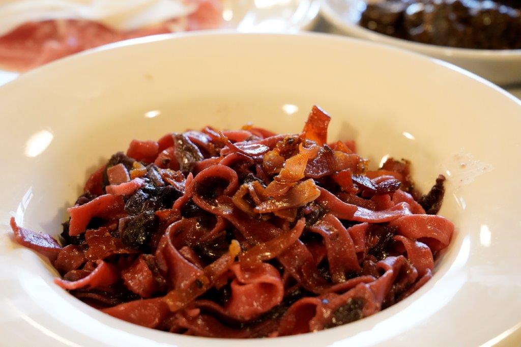 今回のメインのパスタは、葡萄果汁が練りこまれたパスタ。見たことがないパスタですが、ほどよいワインの味と野菜がマッチした珍しい味。勿論、美味しく・・・ワインがすすみます。 イタリアでは食後にデザートワインであるヴィンサントにビスコッティを浸していただくのが一般的。 別料金となりますが味わってみてはいかがでしょうか。