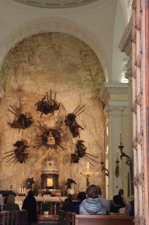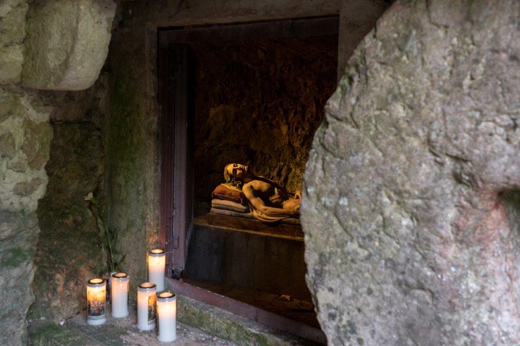 最初の十字架を運ぶ姿から、最後は処刑の様子、そして石の扉の中に置かれていたキリストが翌日、閉ざされていたはずの石の扉が開きキリストが居なくなっていた・・・ そして、16世紀に完成したマドンナ デラ コロナが見えてきます。