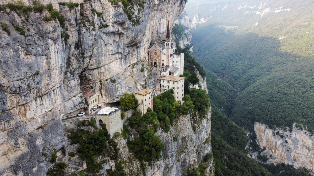 マドンナ デッラ コロナ サンクチュアリーから眺めるアディジェ谷の渓谷の絶景にも感動です。 往路は下りですが、復路坂道が苦手な方はパーキングと教会近くバス停間ピストンシャトルバスがあります。(片道3ユーロ 2020年9月時点)