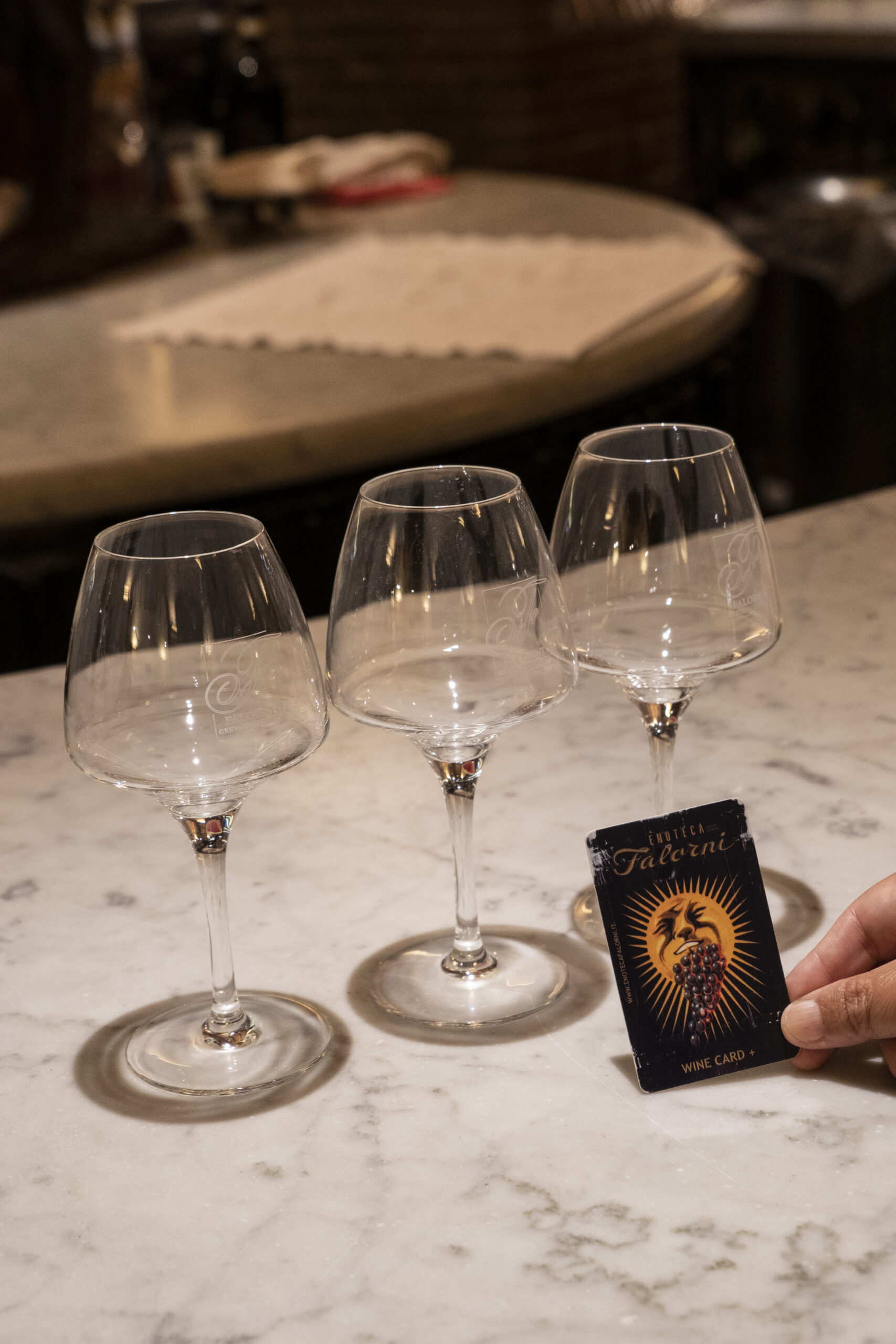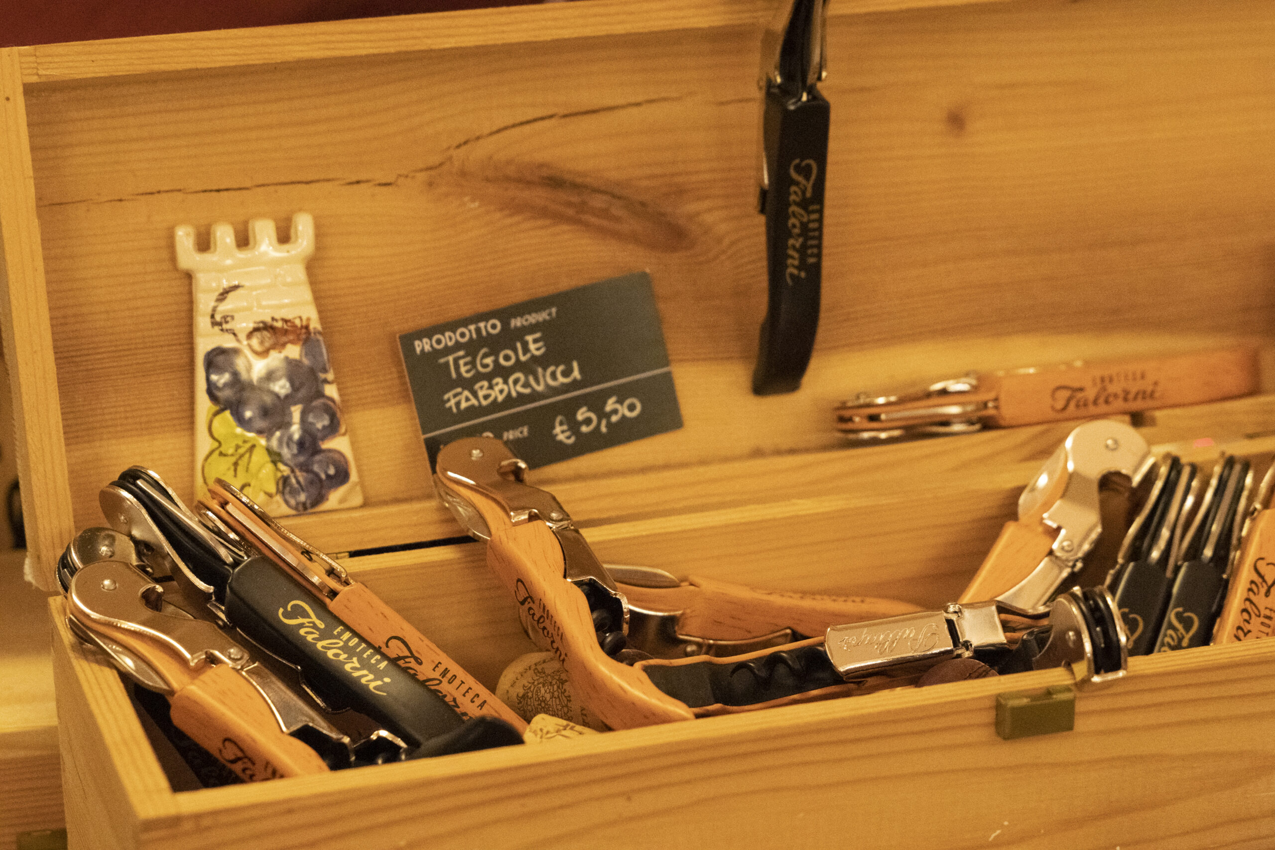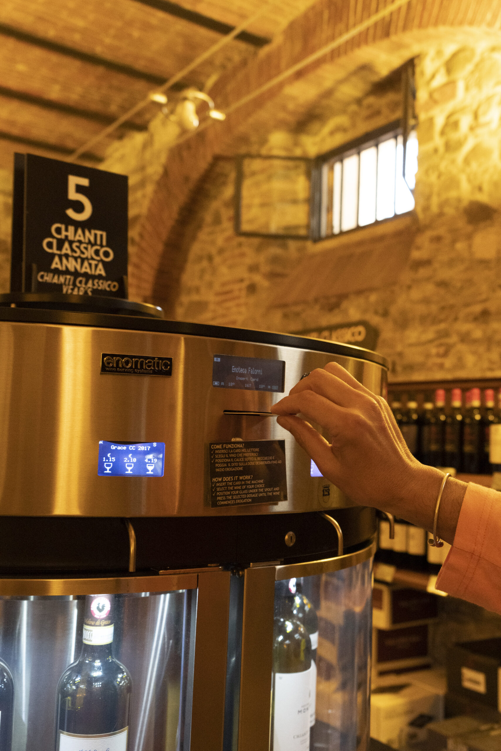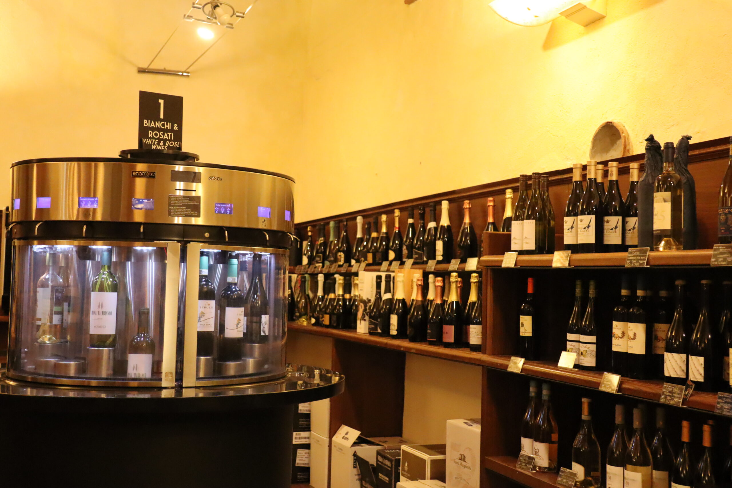 テイスティングマシーンの利用は、カウンターで名前、住所、連絡先などを記入しプリペイドカードとワイングラスをいただきます。カードをマシーンに挿入して好みのワインのボタンを押します。その際にテイスティングの量も選べます。ワインによって金額が違うのでキャンティクラシコの高いワインだとボトルで購入するには通常100ユーロ以上するものは手が出ませんが、テイスティングの量であれば気軽に味わうことができます。こちらのワインの場合、3種類の量1.15ユーロ、2.10ユーロ、4ユーロからチョイス。あとはグラス に注ぐだけ。ワインにちょっぴりおつまみが欲しい方は、カウンターでハムやチーズの盛り合わせをオーダー することができます。そのほか、エノテカ内ではワイングッズも販売されています。このエノテカはカップル のデートコースとしても利用されています。お好みのワインが見つかるとボトルを購入。