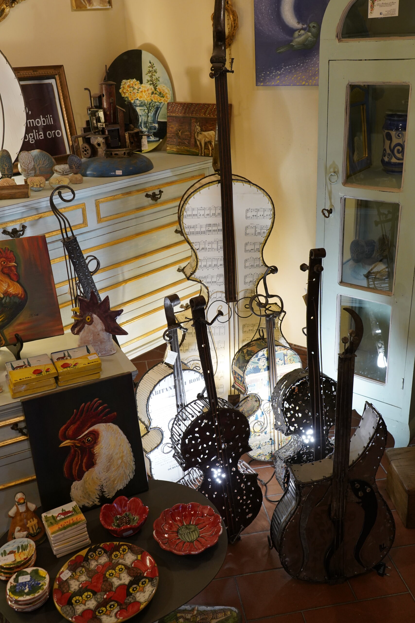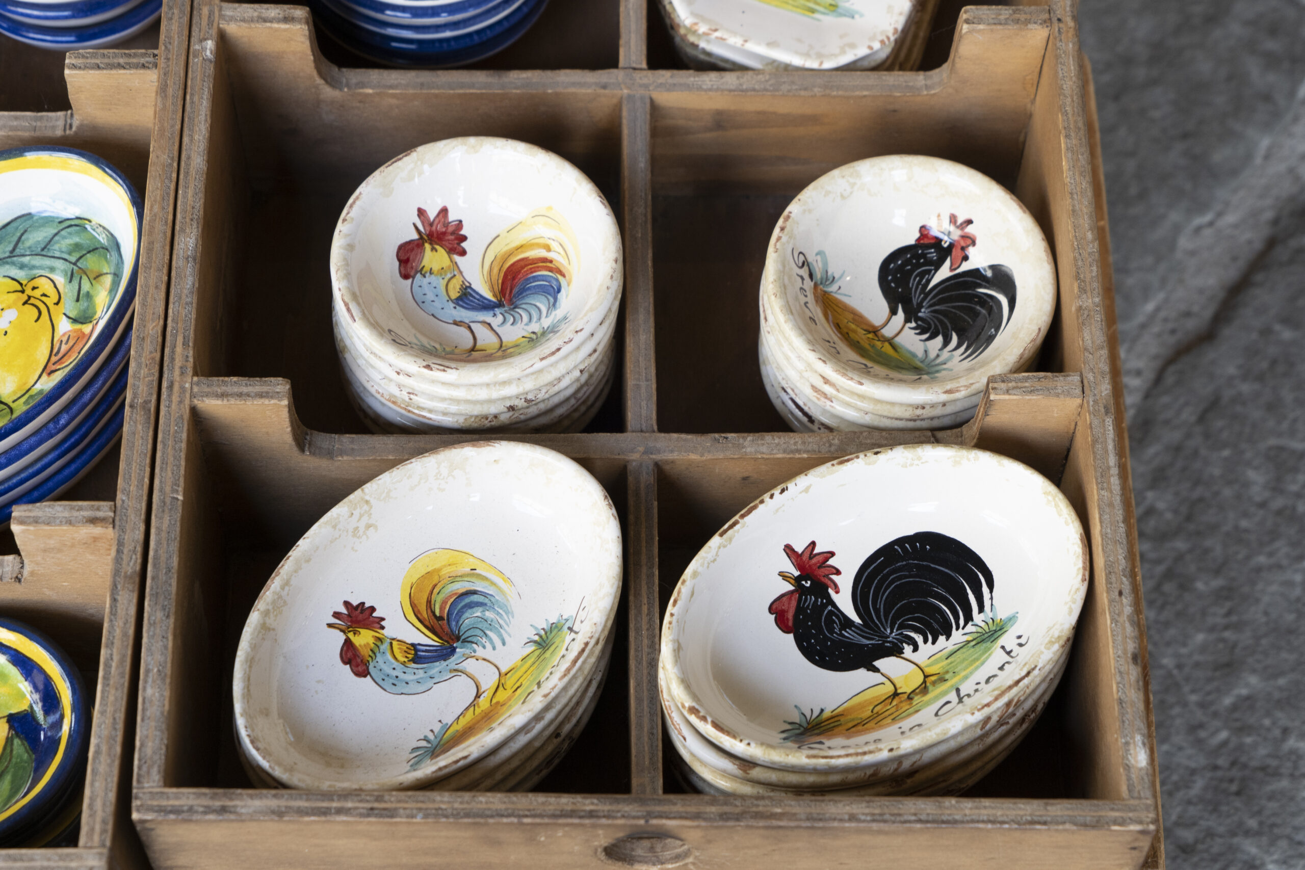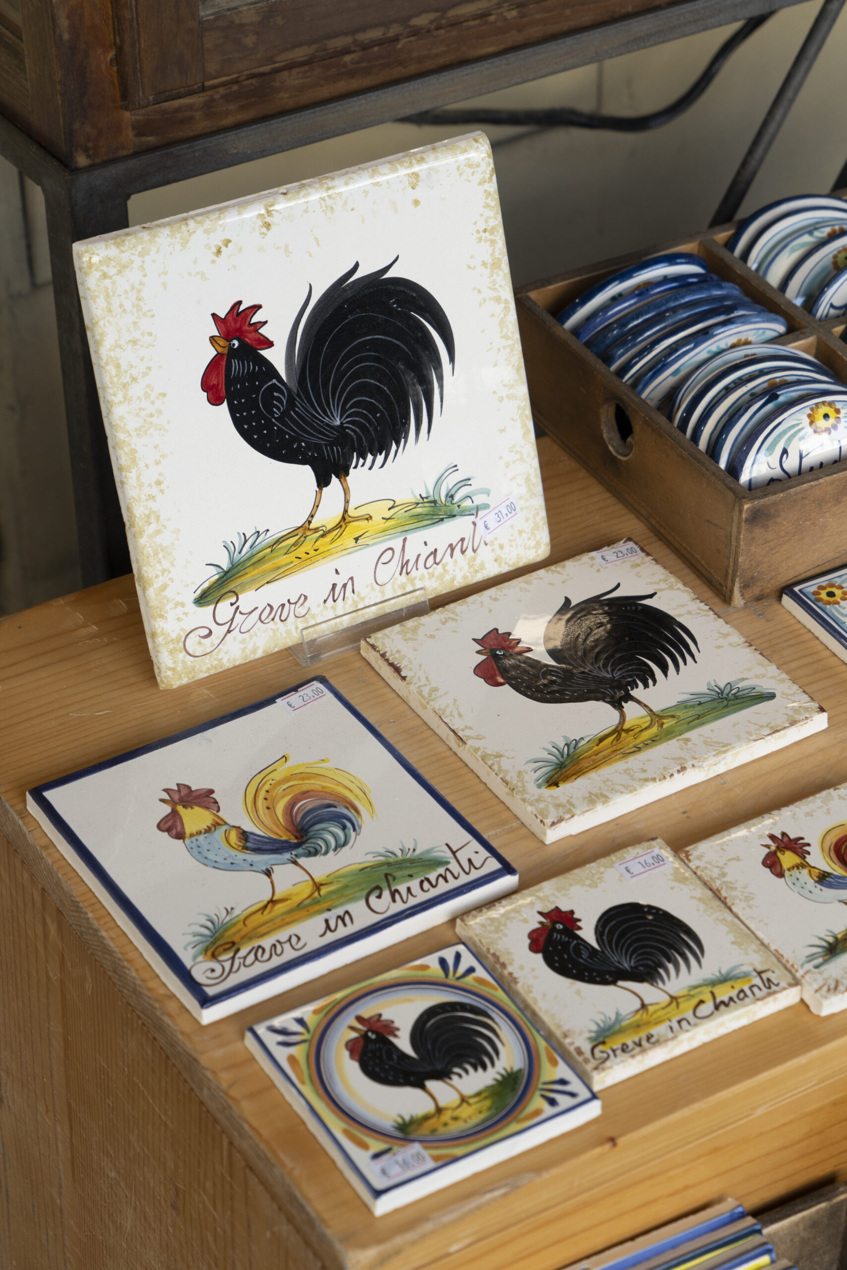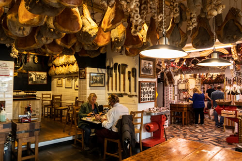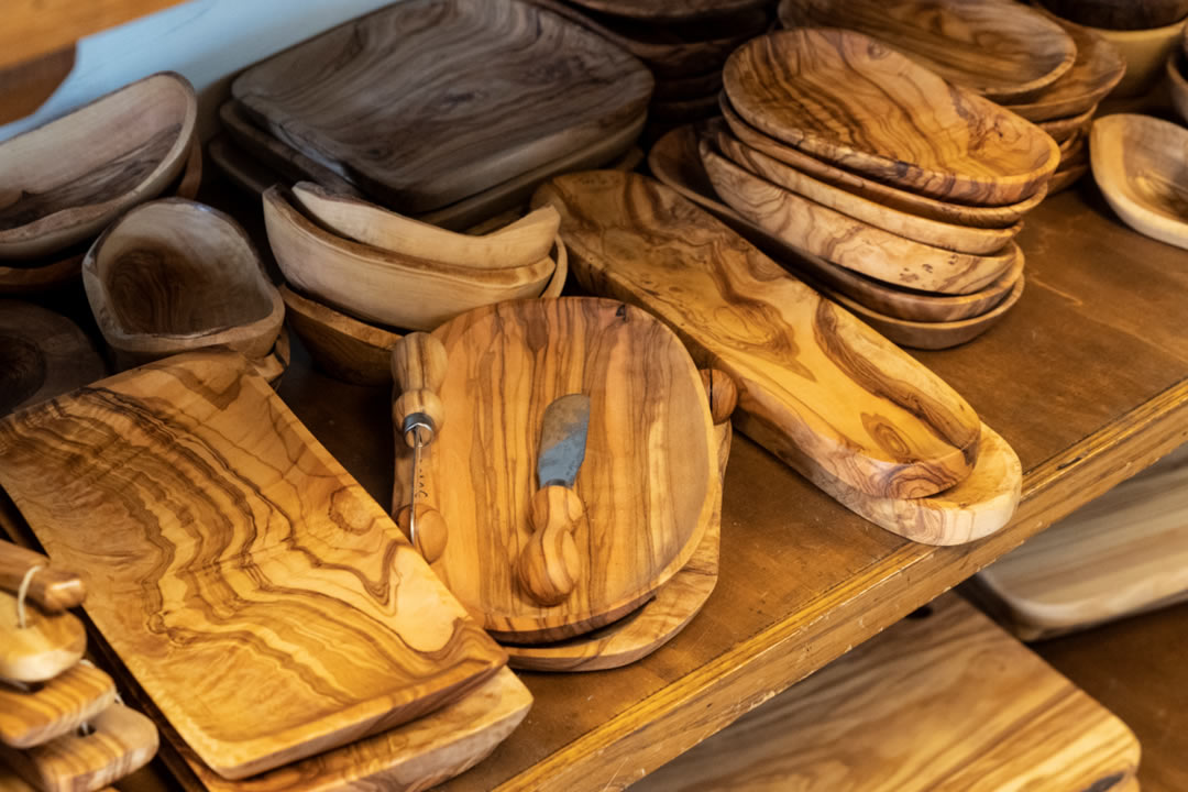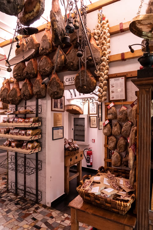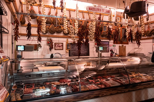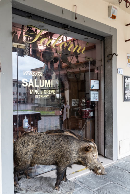 テイスティグのあとは、グレーベの町へ。(徒歩圏内)小さな町ですが、キャンティクラシコグッズやオリーブ の木専門店、こちらではオリーブの木で造ったボードや器や小物など、オリーブの木は頑丈なため割れること もなく長持ちします。そのほか、肉屋などプチ散策をどうぞ。 お肉屋さんの入口では豚さんがお迎え。店内には生ハムがズラリ。どんぐりを食べて育った豚のサラミやTボ ンステーキなど、どれも珍しく食べてみたくなります。残念ながら日本へは肉類の持ち帰りは罰金ですのでイ タリア内で消費するしかありません。フィレンツェではキッチン付きレジデンスにお泊りされ、ここで購入し た食材をお部屋で料理又はハム、チーズをカットしキャンティクラシコのワインをエノテカで購入して部屋食 はいかがでしょうか。