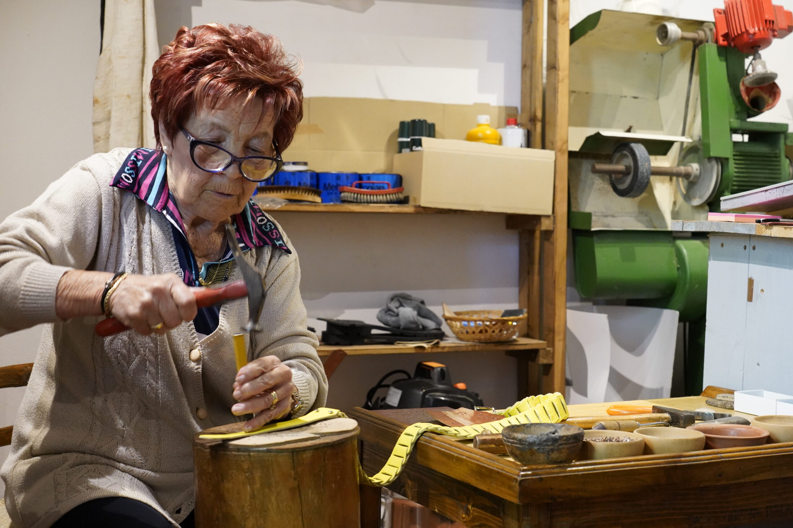 ショップをキリモリするのはオーナーの奥様。ご主人は別の場所にある工房で靴を作っているそうです。 ベルトの調整はショップでお母さんが一生懸命愛情注ぎながら作っています。