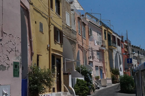 イエロー、スカイブルー、ピンクの建物が密集しているこの景色はプロチダ島の観光スポットとなっています。