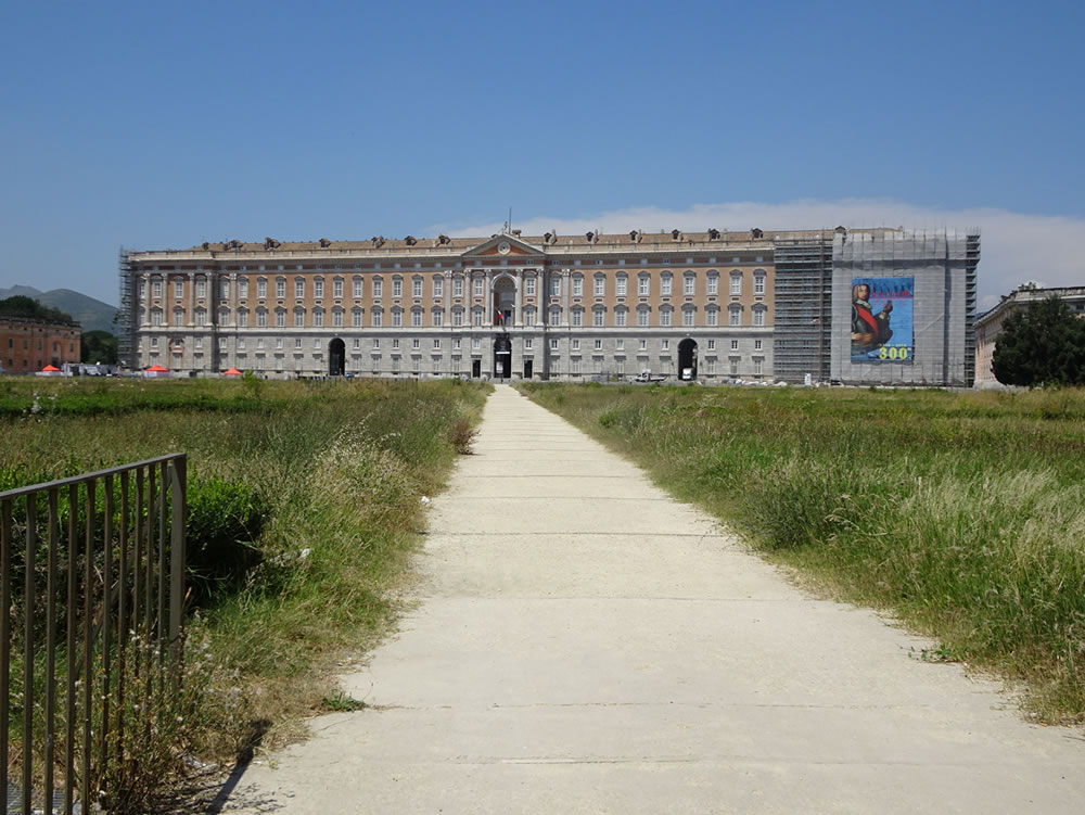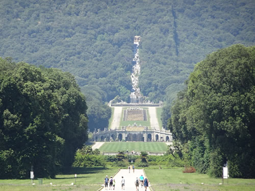 18世紀当時のナポリ王、ブルボン家のカルロ3世がベルサイユを凌ぐ宮殿をめざしてカゼルタに建設した王宮は、劇場、礼拝堂、博物館、1200もの部屋がある巨大で壮麗な建物。また120ヘクタールの庭園は、中央をまっすぐに走る3kmの道、滝、ギリシャ神話の彫刻噴水群を配し、周囲の森林とあいまって華麗で洗練された芸術作品です。