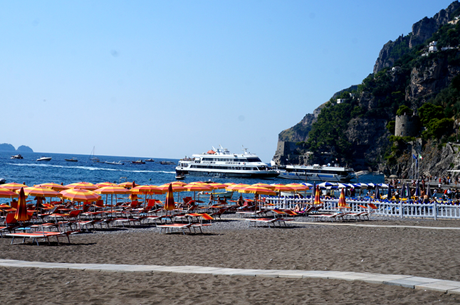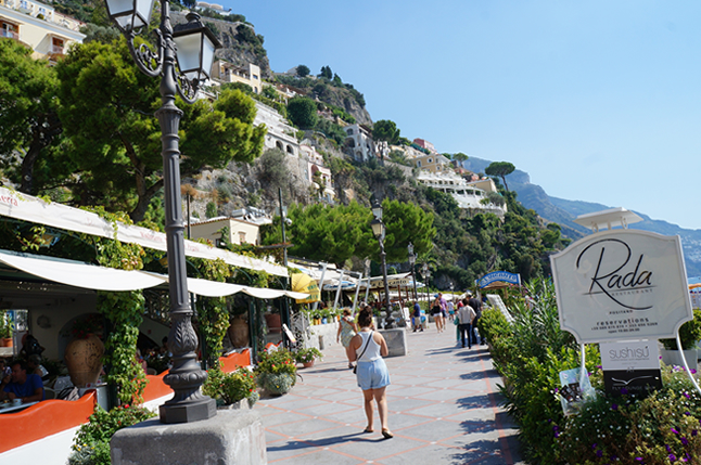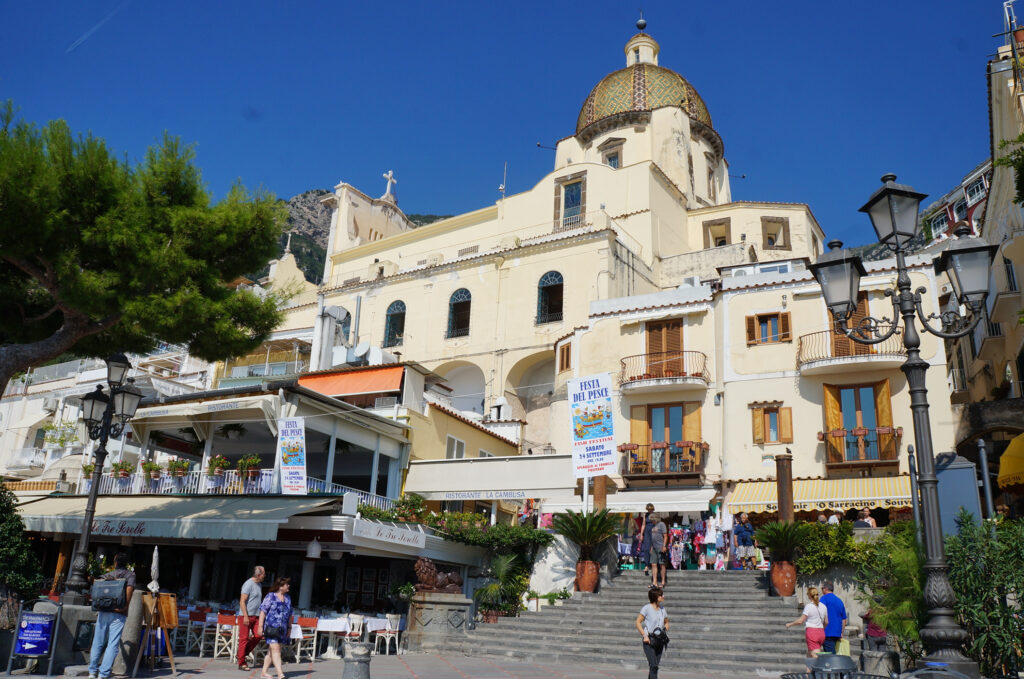 ポジターノのシンボル大聖堂。大聖堂から丘の上まで行く道のりの途中、素敵なレストランやお土産店などが立ち並び活気あふれています。南イタリア名物レモンのコスメショップやレモンチェッロリキュールショップやリゾートファッションなどショッピングも目白押し! 急な坂が多いポジターノ&アマルフィ。歩くのはちょっと大変ですが、上までいくと見えてくるのがシーフード中心のレストラン。青い海と太陽の下でいただく南イタリアで捕れたシーフードプラターのランチ!贅沢な時間になりかもしれません。