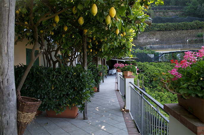 ご案内するアグリツーリズモはレモン農家。丘の中腹にある段々畑には、緑濃いレモンの木がところ狭しと植えられており、5月から6 月のレモンの花が咲く時期になると、辺り一帯がレモンの香りで満たされます。 朝起きて、テラスに出ると、新鮮な空気のなか、眼下に広がる可愛らしい街と紺碧の海。そして、その風景とのコントラスが美しい黄色いレモンが1 日の初めを迎えてくれます。