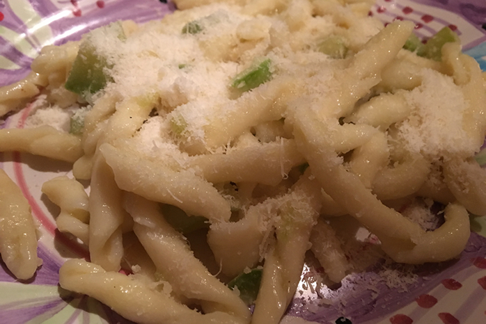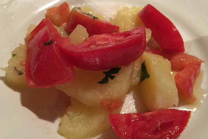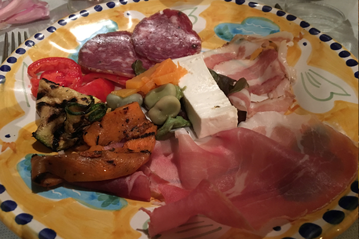 澄んだ山の空気と素晴らしい風景とレモン畑に囲まれた環境で食するアグリツーリズモでの食事は、自家菜園で採れた野菜とアグリ自慢の南イタリア伝統料理が味わえます。 夕飯は通常は20 時から開始。部屋数だけのテーブルが準備され、それぞれがそれぞれのテーブルに着いて食事をします。奥さんが作った料理を、オーナーが各テーブルに運びます。夕食は、前菜からデザートまでのフルコース。 敷地内には野菜畑もあり、季節のお野菜を自家菜園から摘んできて使っています。 どんな料理が運ばれてくるのか、ちょっと紹介すると、アマルフィー特産のサラミや山羊のチーズ、日替わりのパスタ料理(野菜、肉、魚ベースといろいろ)、カポナータ、トマトソースを使ったズッキーノやなすのオーブン料理、ズッキーニの花のフリット、魚のグリル、アグリで飼育している豚、うさぎ、鶏などのお肉のグリル。 それに、敷地内の自家菜園から摘んで来た季節のお野菜が付け合わせで出されます。飲み物は、このアグリの葡萄を使って作られた白ワインや赤ワイン。それに、レモン水も欠かせません。デザートももちろんマンマ のお手製。レモンを使ったお菓子が登場します。 ちょっと食べ過ぎた?そのときは、アグリ手製のレモンチェッロを食後酒に頂きましょう。