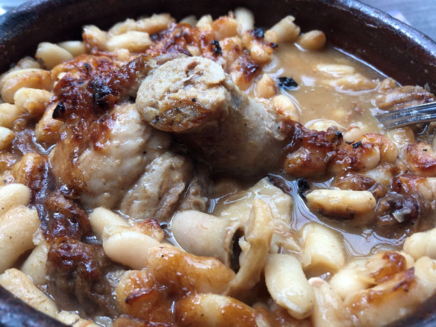 白いんげん、豚肉、鴨又はガチョウのコンフィー、ソーセージがぐつぐつと煮込まれたアツアツの料理。