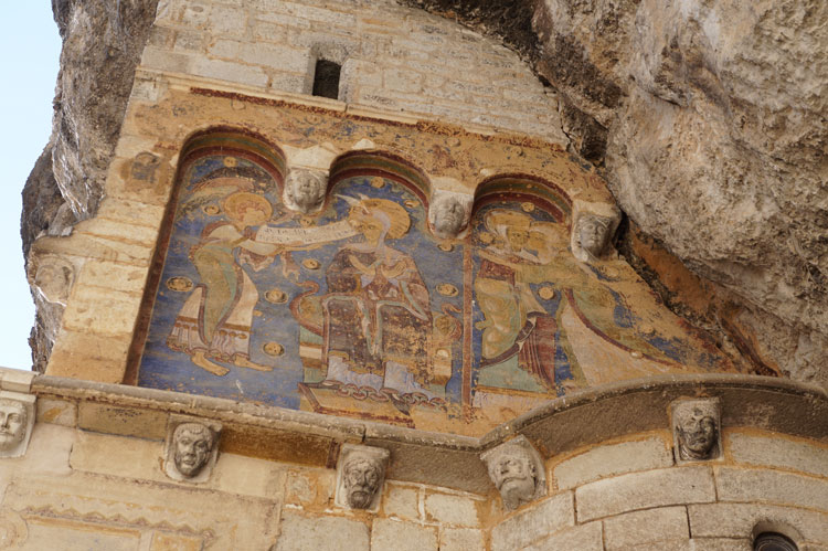 ロカマドールはスペインのサンチアーゴ・デ・コンポステーラへ続くフランスの巡礼地としてサン・ソヴール・バジリカ聖堂とノートルダム礼拝堂はユネスコ世界遺産に登録されています。 ロカマドールに到着すると、聖域の建物へは216段もある巡礼者の階段を上って行きます。中世の巡礼者たちはこの階段を祈り捧げながら両膝だけで上っていました。 階段を上った所に中庭があり、聖堂と6つの礼拝堂が集まっています。そのうちの一つ、サン・ミッシェル礼拝堂の正面には外の岩壁に描かれた12世紀頃のフレスコ画。日陰にあるため保存状態がよいまま残っています。