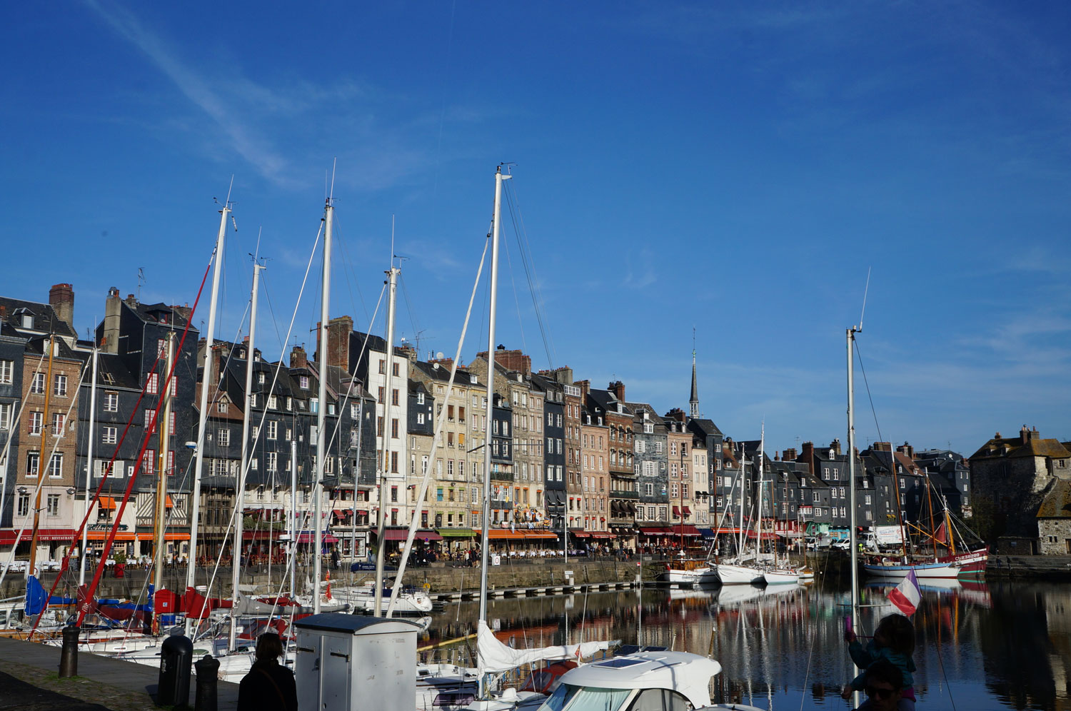 木組みの建物と港のヨットが絵になるポストカードのような風景の街オンフルール。