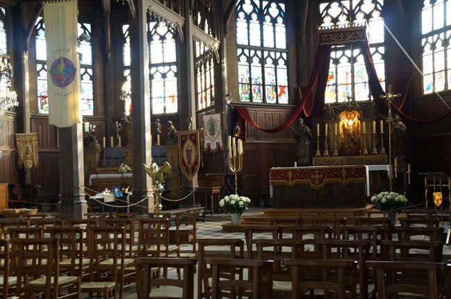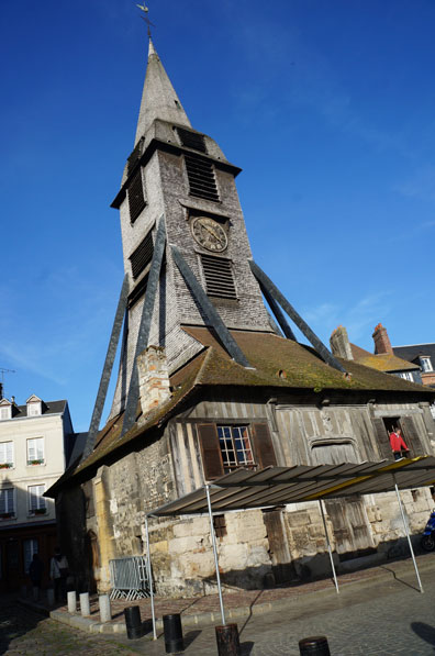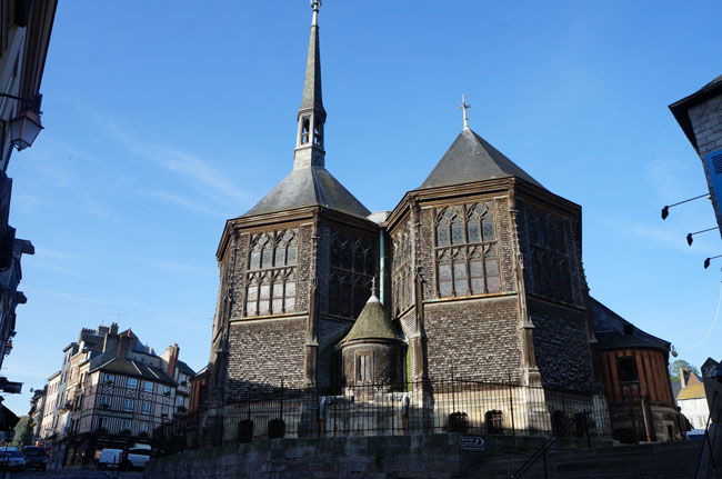 造船をモデルに作られた珍しい木造教会。教会内部の天井は、船の底面のようなつくりをしておりオンフルールらしい教会です。また教会入口の対面には鐘楼堂があります。 雑貨店などが並ぶ旧市街には画家たちが訪れていた街なだけにアートギャラリーが数軒点在しています。