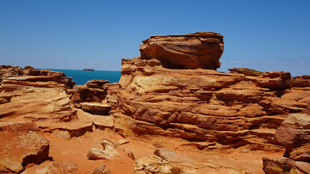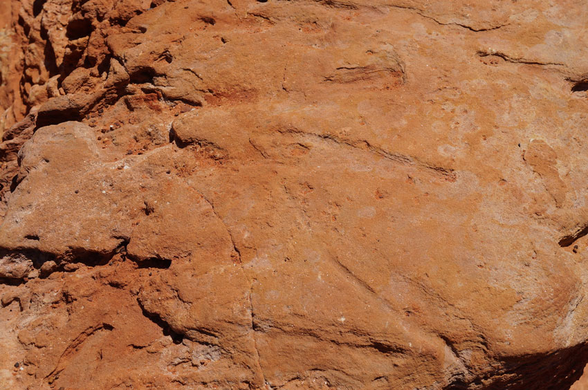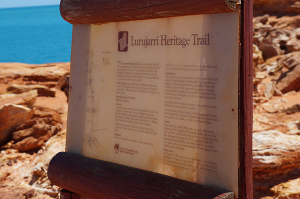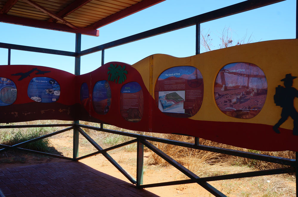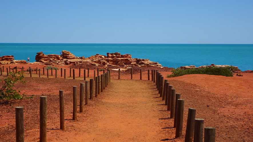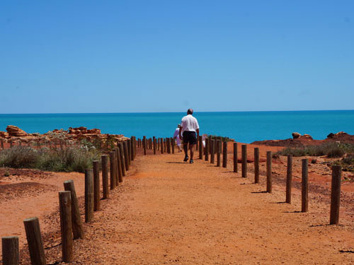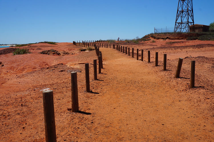 ブルームの西南の外れに赤い断崖の海岸にあるガンシュームポイントに、1億300万年前の恐竜の足跡が残っていますが、30メートル沖合にあるので引潮のときにしか見ることができません。 ここから岬へと続く赤土の道を歩いたところにディアノサウルスの足跡のレプリカが飾ってあります。 ガシュームポイント付近はこのように舗装がなくオーストラリアらしい自然を感じることができます。 くれぐれも足元に気を付けて下さい。