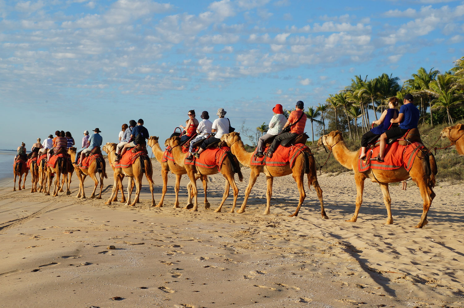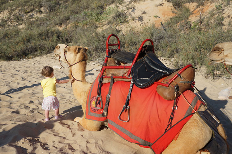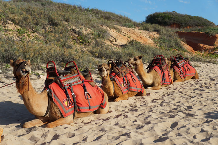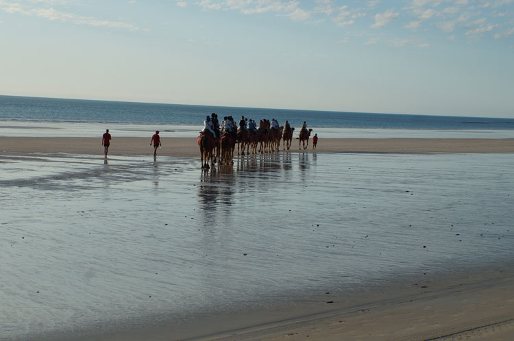 夕方になったらやってくるラクダさんたち。 ケーブルビーチに到着したら一列に並んで待機。ラクダはとてもおとなしいので小さなお子さんが近づいても暖かく見守ってくれています。予約者全員が揃ったところで・・さぁ 出発です!