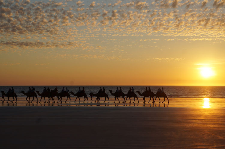 22km続く白砂のビーチとターコイズ色の海、インド洋に沈む素晴らしい夕陽、3拍子揃ったこのケーブルビーチは遠浅で子供でも安心して楽しめるビーチ。 最近、恐竜の足跡が見つかったと話題になっています。 まずは、サンセットキャメルライドへご案内しましょう。