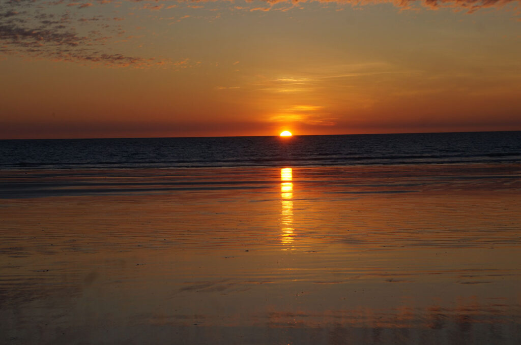 いろんな時間帯のキャメルライドツアーがありますが、やはり一番人気はサンセットが特に人気! だんだん暗くなってくると、途中でUターン。 帰りは素晴らしい夕日の景色へと変わり、ケーブルビーチで見る夕日は、ため息がでるほどの美しさ。砂浜に鏡のように映る空はとても幻想的でとにかく感動!ブルーム観光の忘れられない思い出となることでしょう。