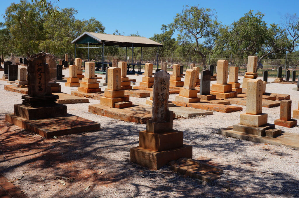 ブルームでは1896年ごろから真珠産業がさかんで多くの日本人パールダイバーが真珠の採掘のためここブルームに移民し、真珠技術に優れた日本人も多く住んでおりました。サイクロンなどにより採取に携わった潜水夫900人以上が亡くなり建てられたのがこの日本人墓地。この墓石は日本に向けて建てられています。墓石の中には100年以上経っているものもあり、貴重な文化遺産になっています。