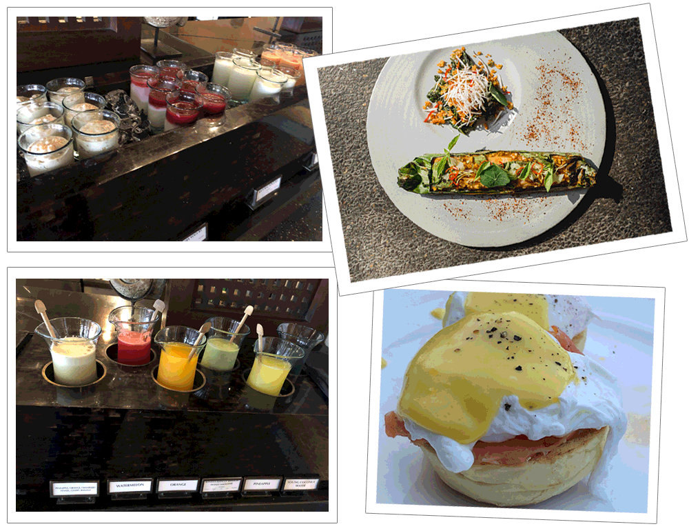 まずは数種類並ぶフレッシュな野菜やフルーツのジュースにヘルシーな素材のヨーグルト。 メインは毎日替わるジャスミンライスやヌードル、カレー、ナシゴレンなどのインドネシアンクイジーン。 オーダーできる卵料理は、目玉焼きやスクランブルエッグ、ポーチドエッグの他、エッグベネディクトも OK! とってもヘルシーな朝食で1日がスタート!